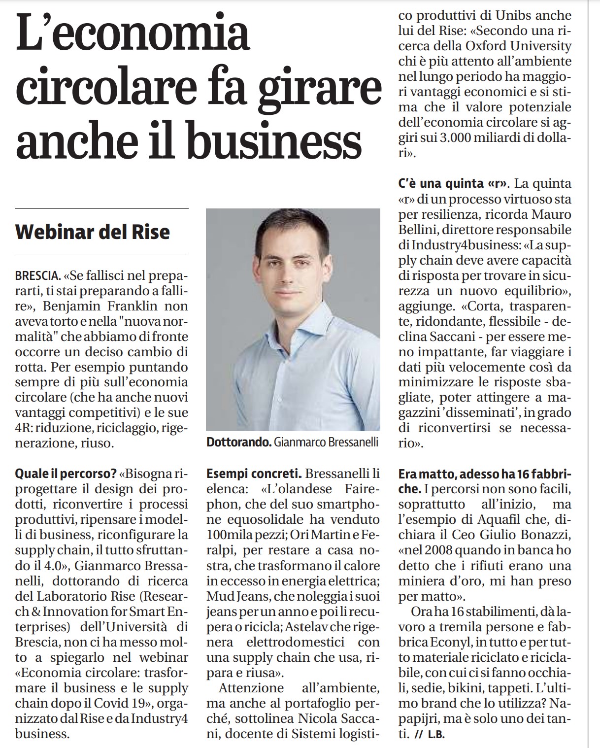 maggio 2020 Giornale di Brescia,, maggio 2020 L'Economia Circolare fa girare il Business Giornale di Brescia